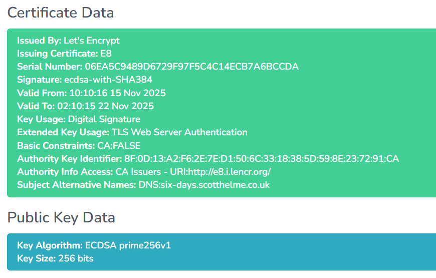 acme.sh --issue --dns dns_cf -d six-days.scotthelme.co.uk --force --keylength ec-256 --server letsencrypt --cert-profile shortlivedAfter the certificate was issued, I got my notification from Certificate Transparency monitoring via Report URI, and I could see the full details of the certificate. Here they are: