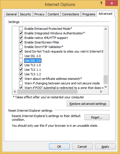 Fixing up Internet Explorer is also pretty easy. Go to Settings, Internet Options and click on the Advanced tab. Scroll down until you see the Use SSL 3.0 checkbox and uncheck it.